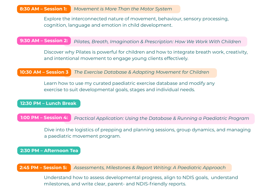 - Comprehension of how Pilates influences each key area of Child Development and be able to prescribe Pilates based on this.